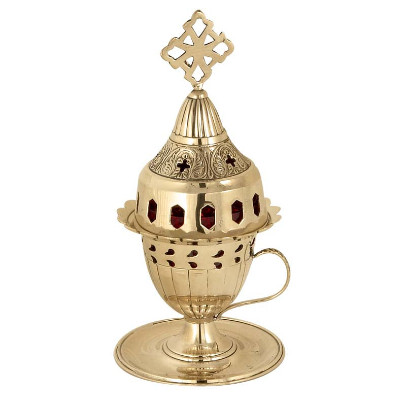 Κομψό μπρούτζινο επιτραπέζιο καντήλι με βοηθητικό πιατάκι και λαβή, προσδίδει ιδιαίτερη λάμψη και παραδοσιακό χαρακτήρα στον χώρο προσευχής.