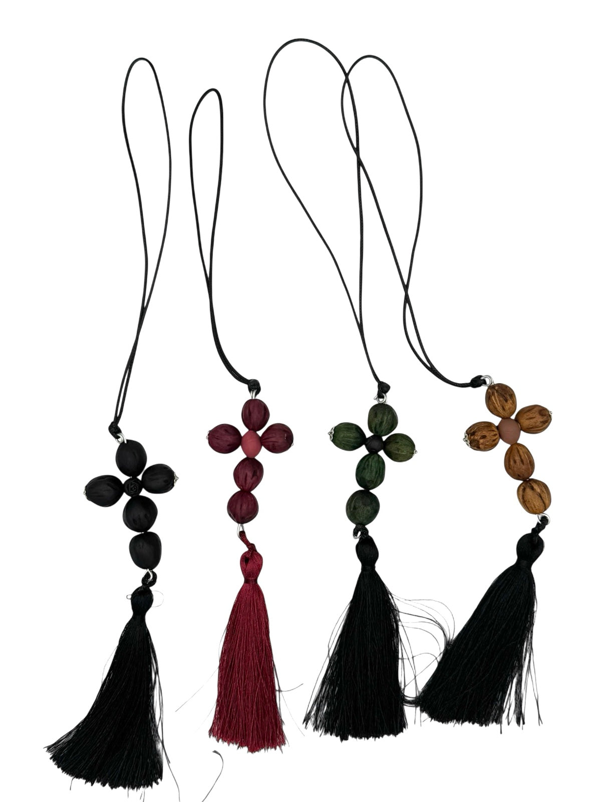 Κρεμαστός σταυρός με φούντα, ιδανικός για χρήση σε καθρέπτες αυτοκινήτου, τσάντα ή ως μικρό ευλογημένο δώρο.