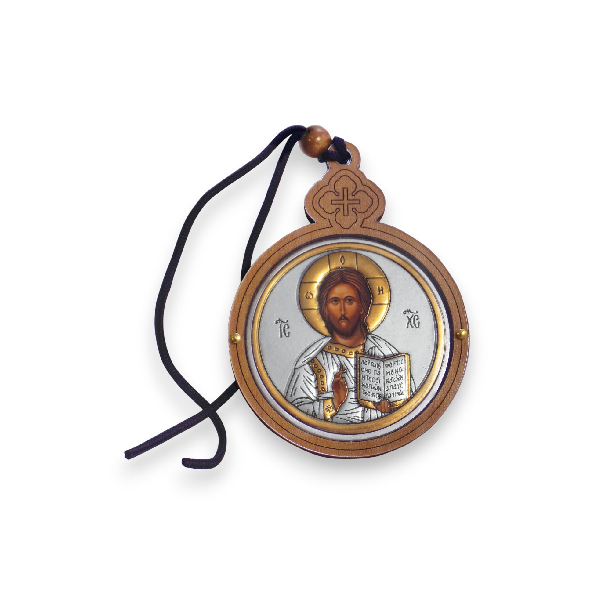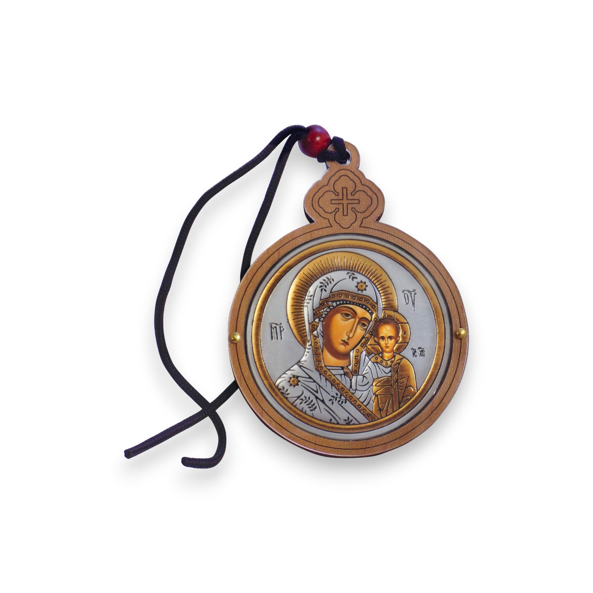 Κρεμαστό ξύλινο με την Παναγία ή τον Ιησού Χριστός, προστατεύεται από plexi glass, με χάντρα και λεπτομέρειες που τονίζουν τον παραδοσιακό χαρακτήρα του.