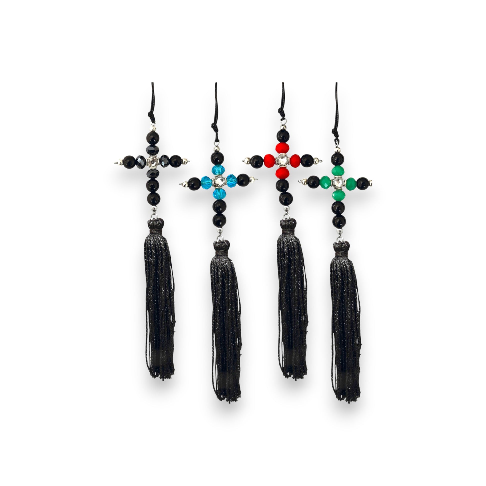 Κρεμαστός σταυρός με χάντρες και φούντα, κατάλληλος για αυτοκίνητο, τσάντα ή για χρήση ως μικρό φυλαχτό.