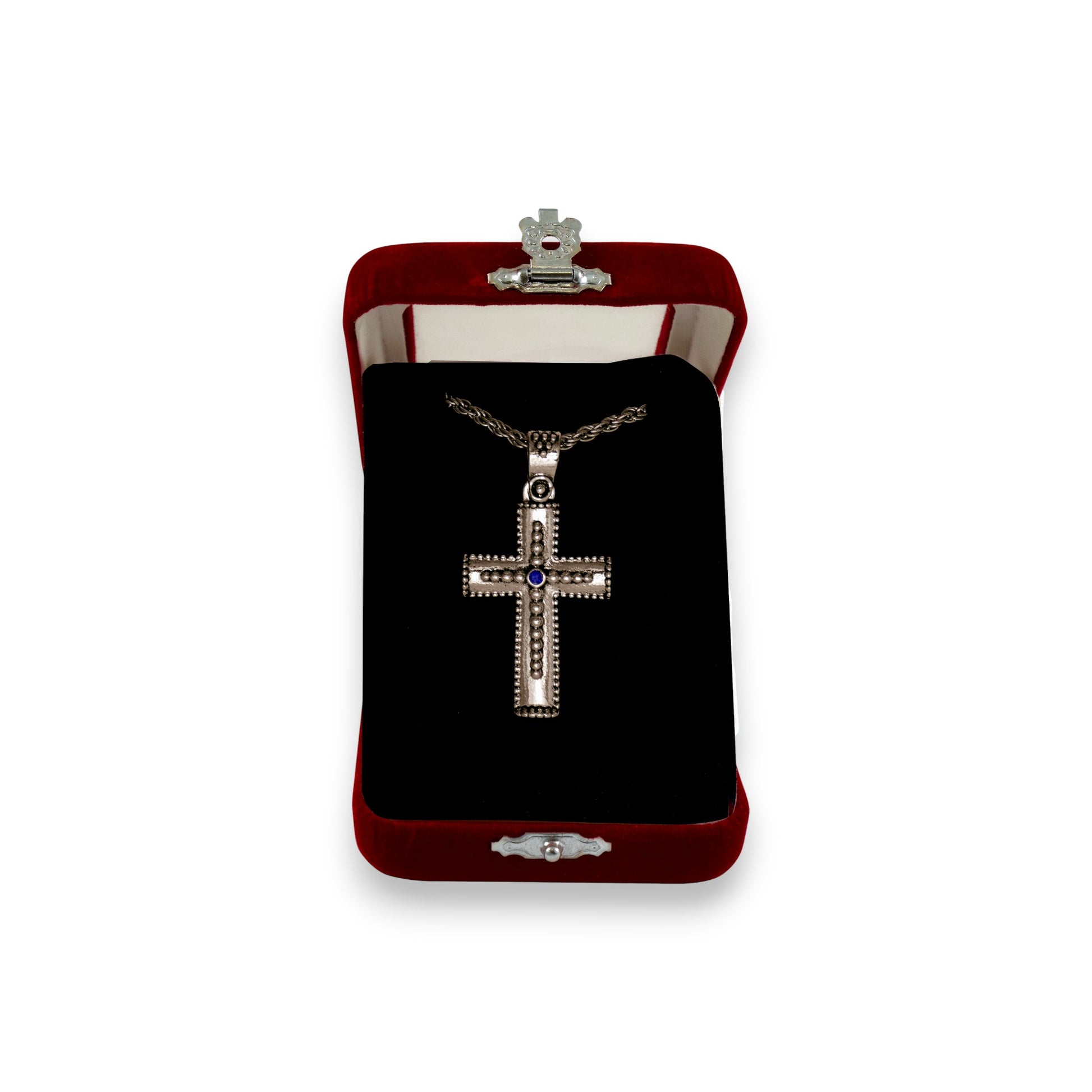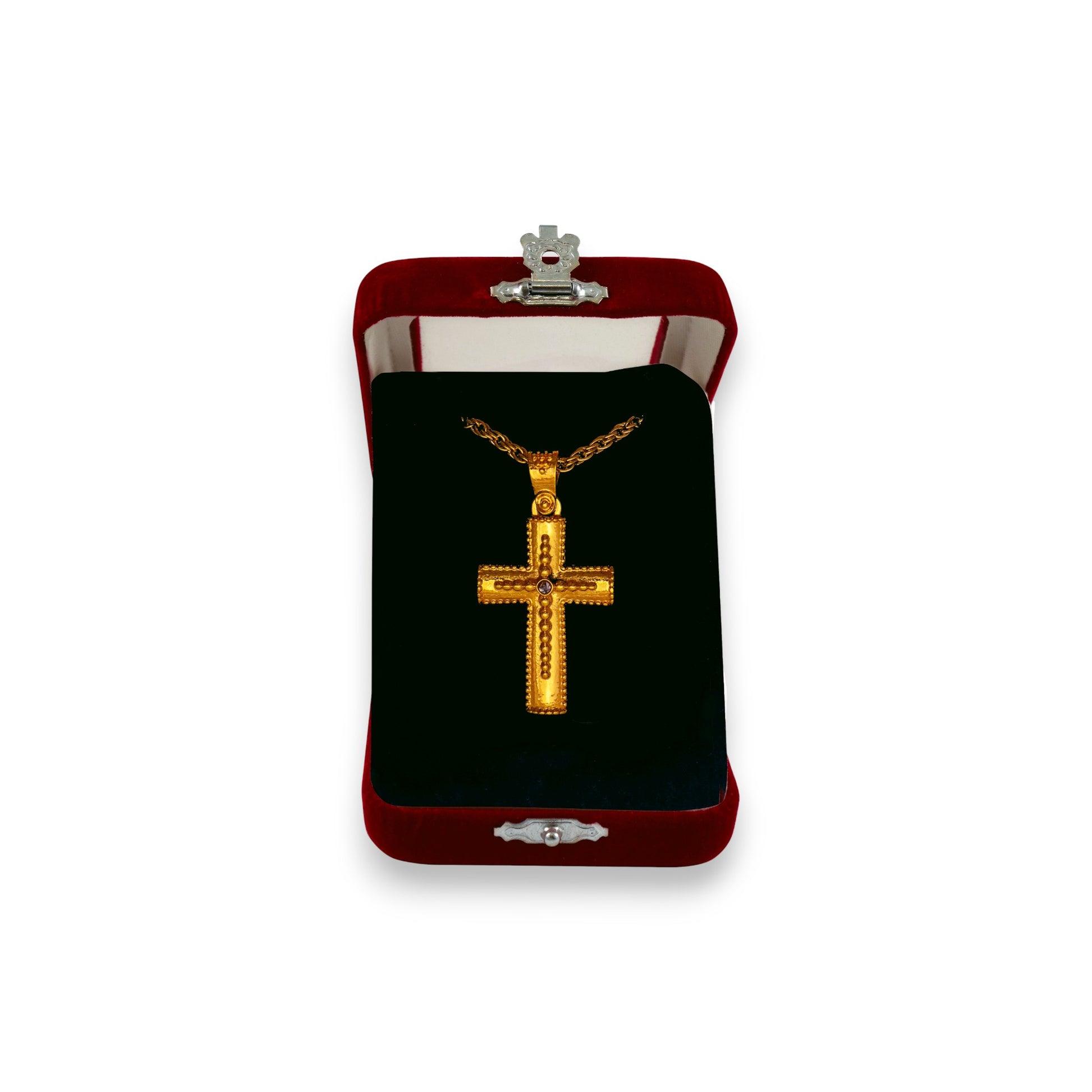 Ο σταυρός συνοδεύεται από ατσάλινο σταυρό λαιμού και αποτελεί ιδανική επιλογή για καθημερινή χρήση, για δώρο ευλάβειας ή ως συλλεκτικό εκκλησιαστικό κόσμημα.