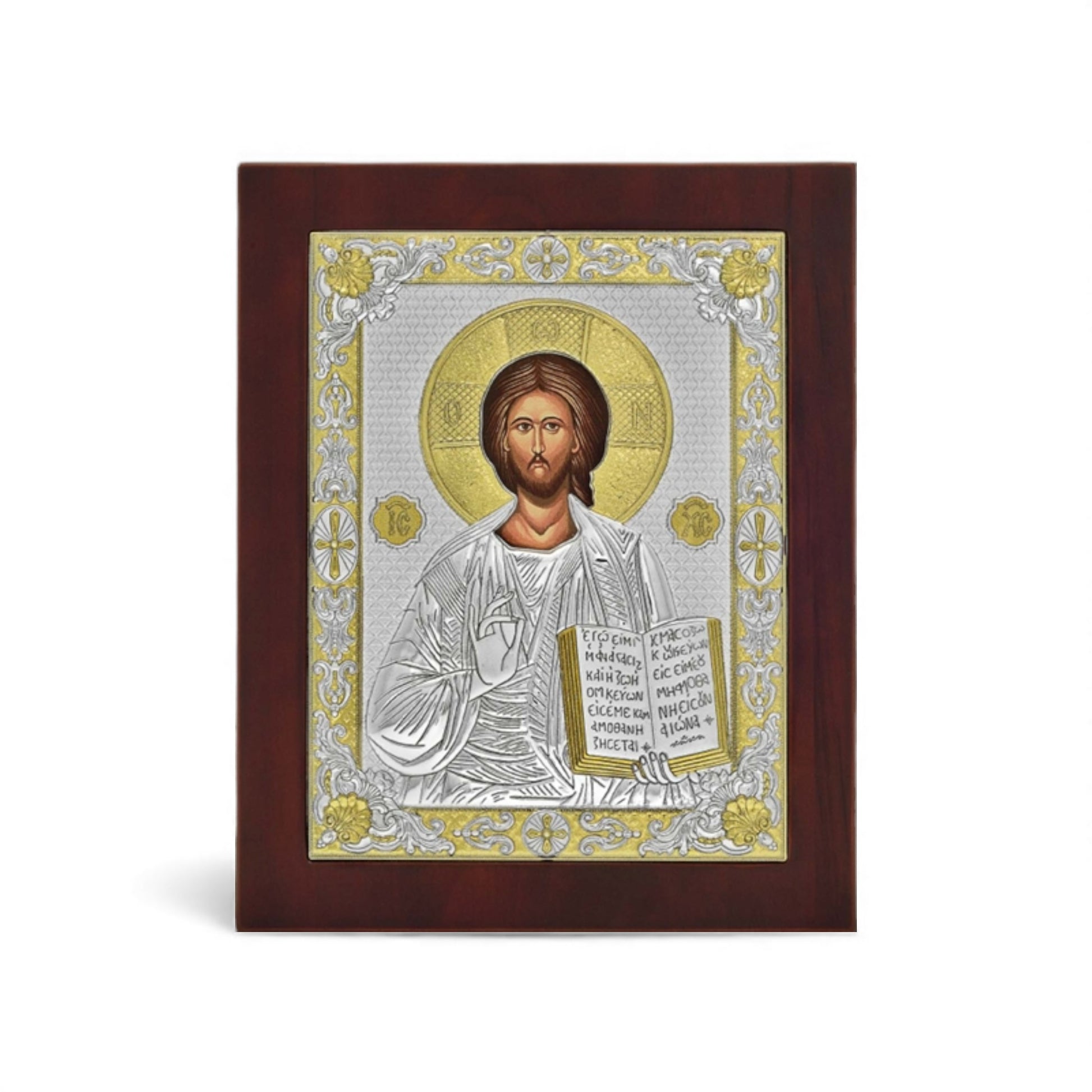 Ασημένια εικόνα του Ιησού Χρηστού με όμορφο ξύλινο πλαίσιο.