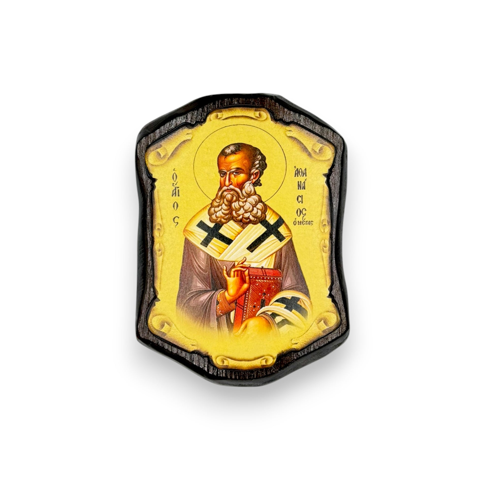 Χειροποίητη εικόνα δύο επιπέδων του Αγίου Αθανασίου , κατασκευασμένη από φυσικό ξύλο καρυδιάς, με ιδιαίτερη ξυλόγλυπτη επεξεργασία.