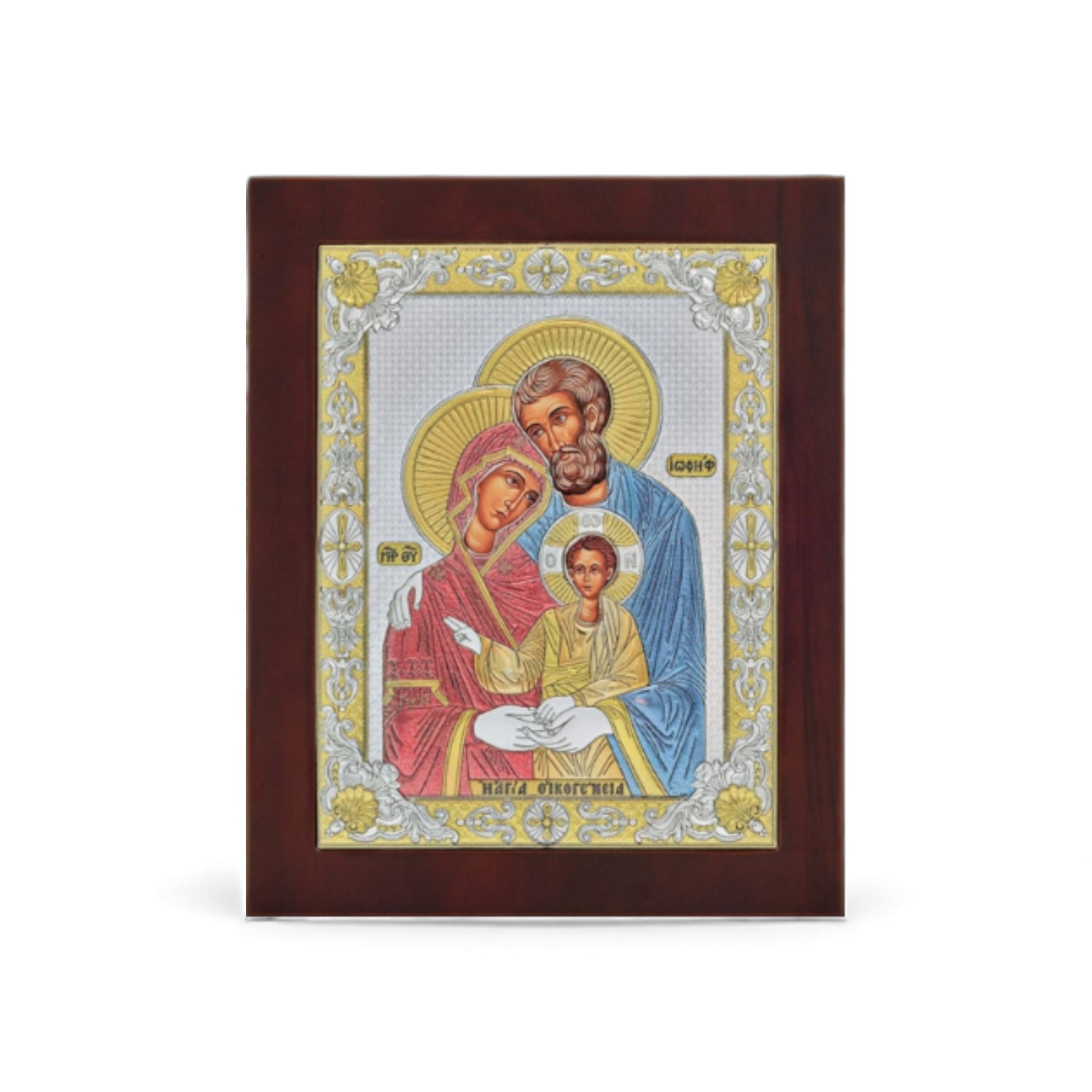 Ασημένια εικόνα της Αγίας Οικογένειας με όμορφο ξύλινο πλαίσιο.