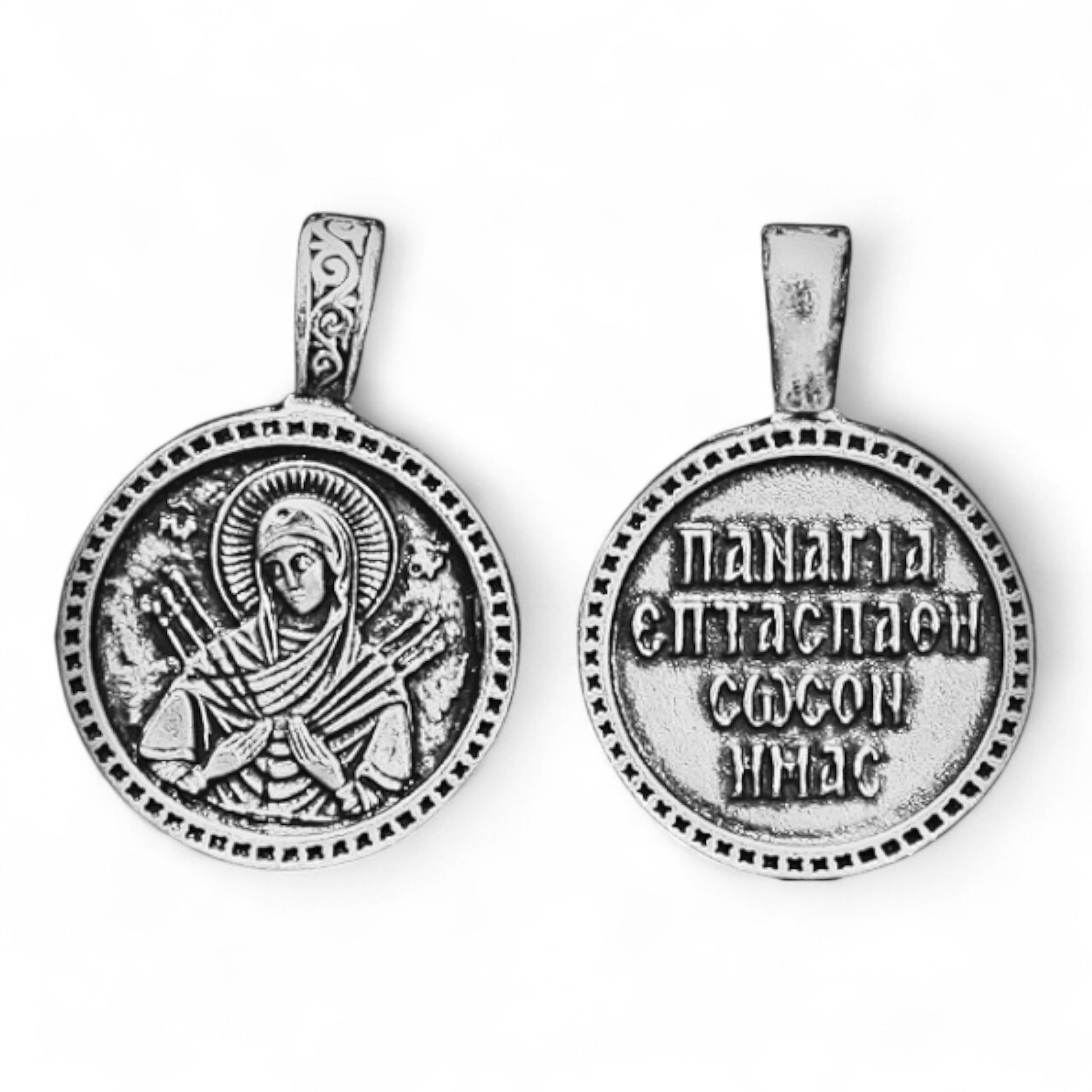 Επάργυρο χειροποίητο μενταγιόν λαιμού με διπλή παράσταση στην μία όψη η Παναγία Επτάσπαθη και στην άλλη προσευχή "Σώσων ημάς..." με λεπτομέρειες.