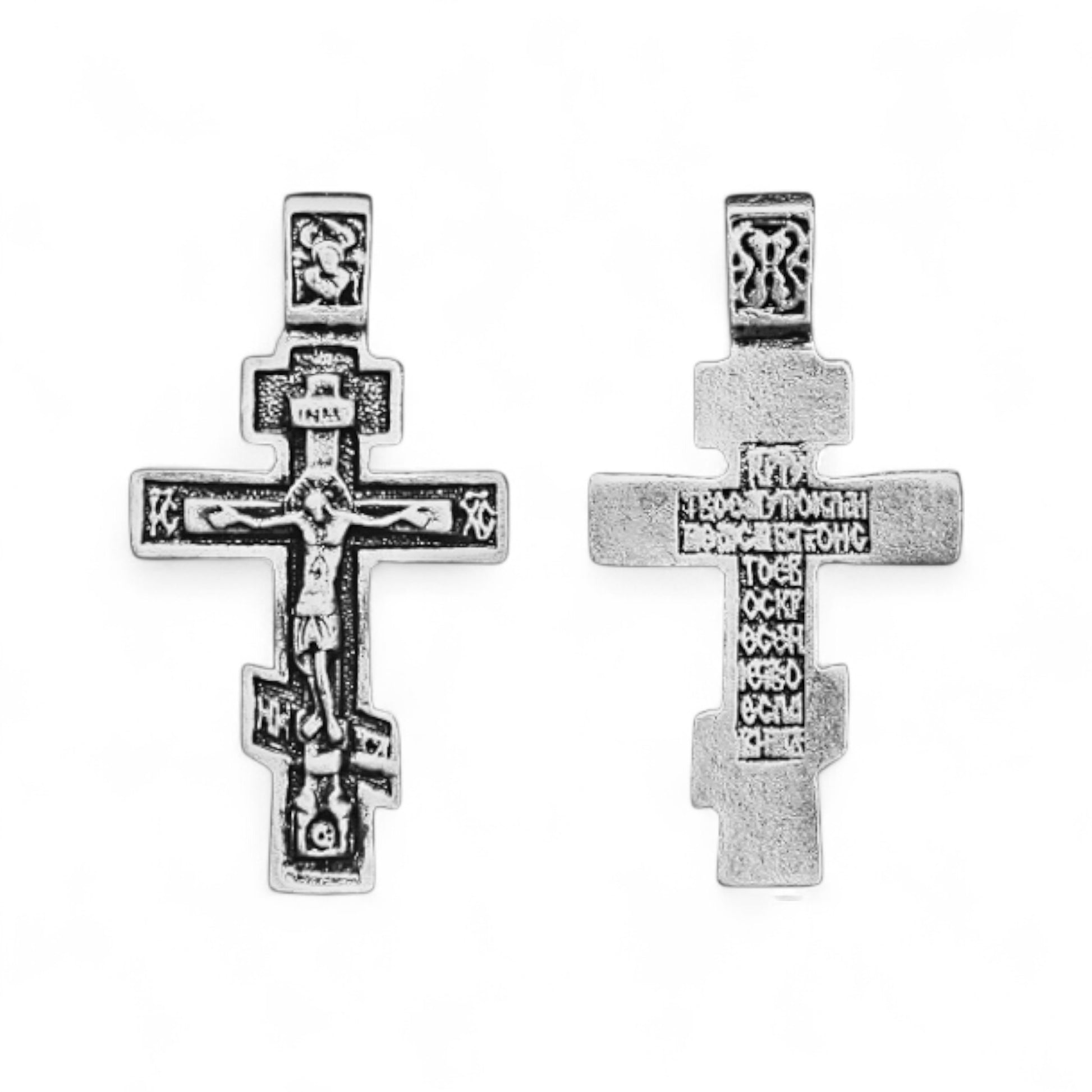 Χειροποίητος επάργυρος σταυρός λαιμού με τον Εσταυρωμένο στην μία όψη και στην άλλη με την προσευχή "Το Σταυρό Σου Προσκυνούμεν Δέσποτα..." καθώς και μαύρο ρυθμιζόμενο κορδόνι.