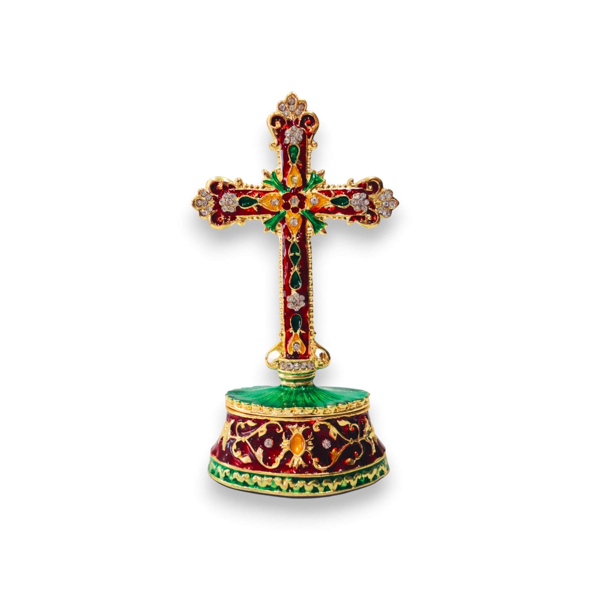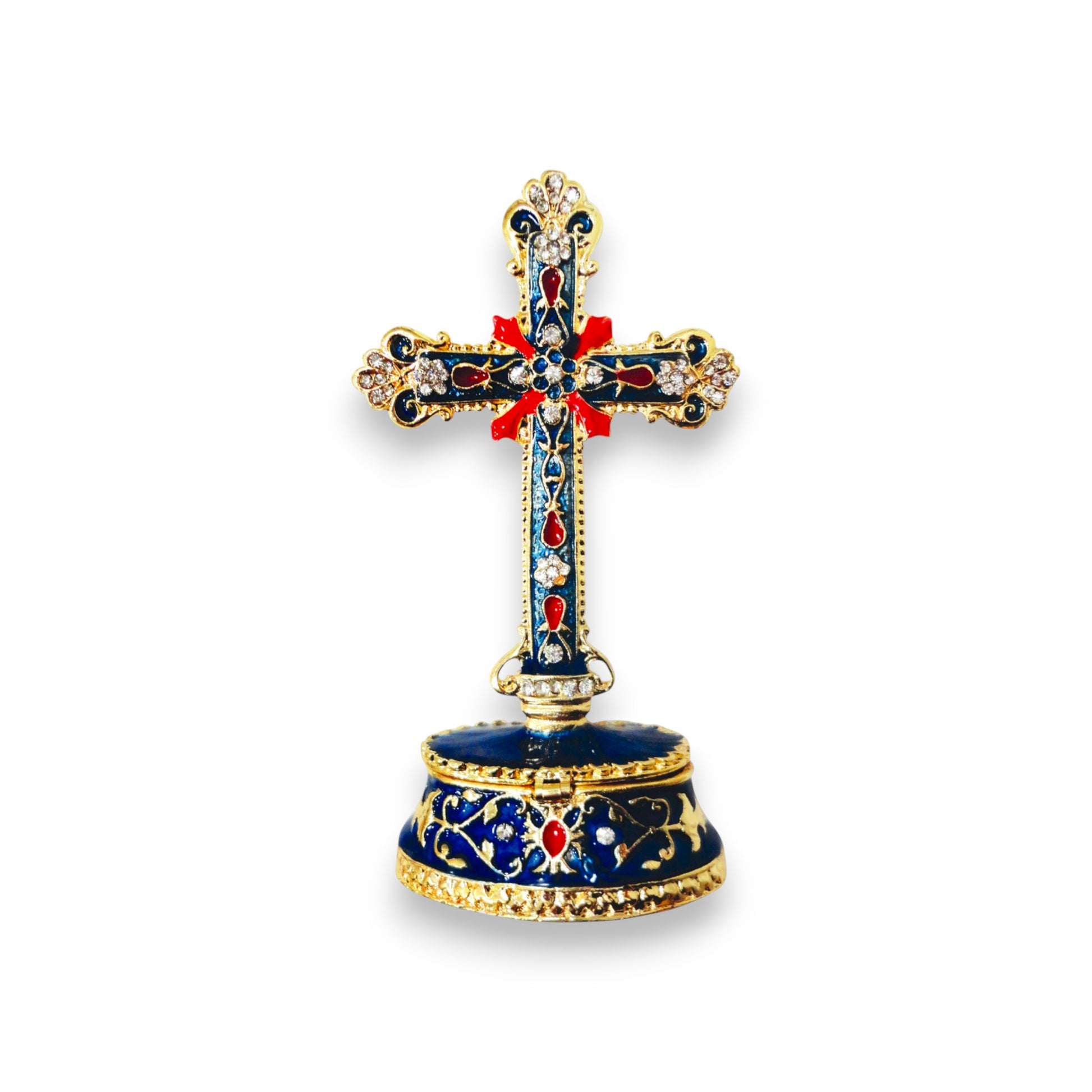 Κομψός μεταλλικός επιτραπέζιος σταυρός με ανοιγόμενη βάση, κατάλληλος για το σπίτι, το γραφείο, το εικονοστάσι ή ως ευλογημένο δώρο.