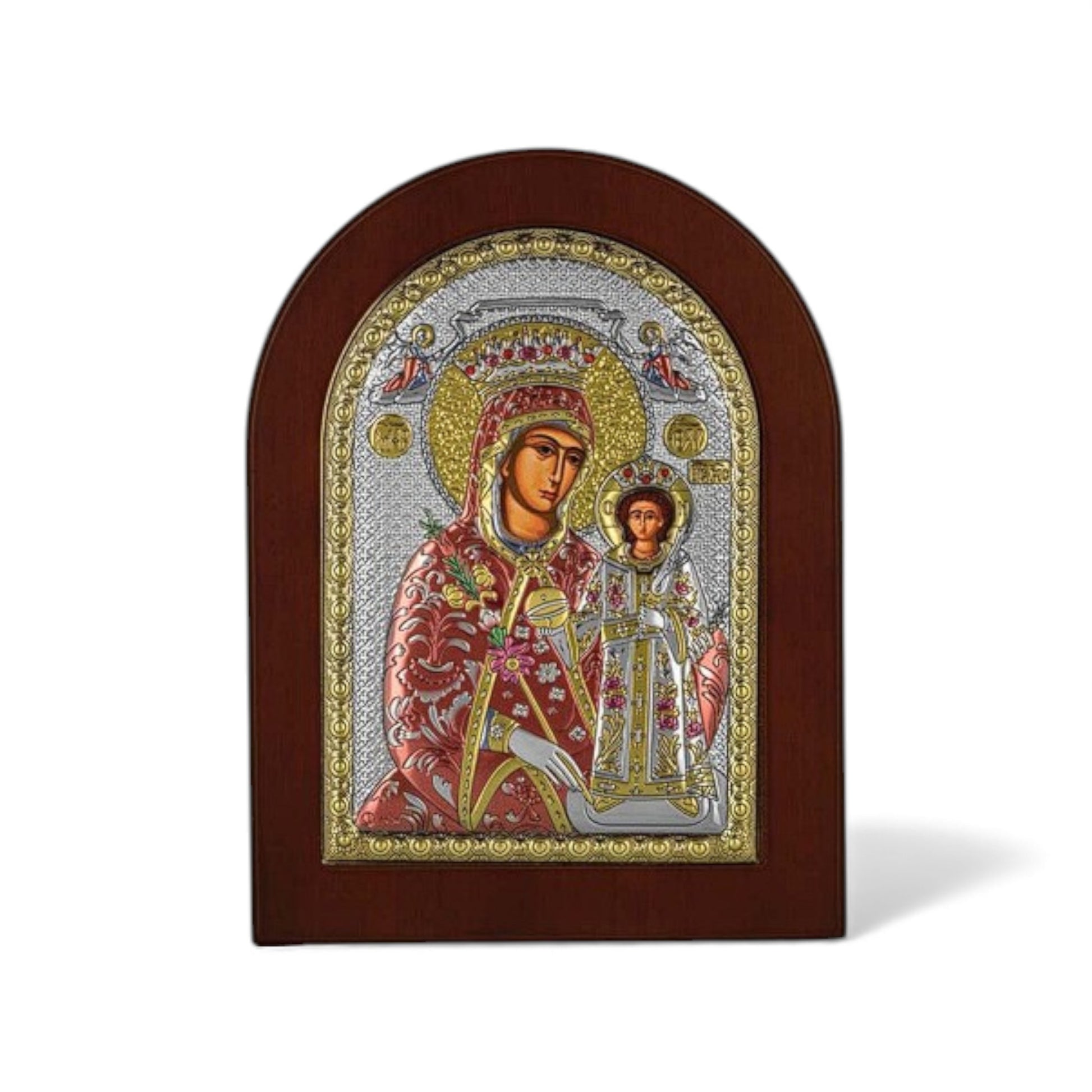 Ασημένια εικόνα Παναγία Ρόδο το Αμάραντο με όμορφο ξύλινο πλαίσιο.