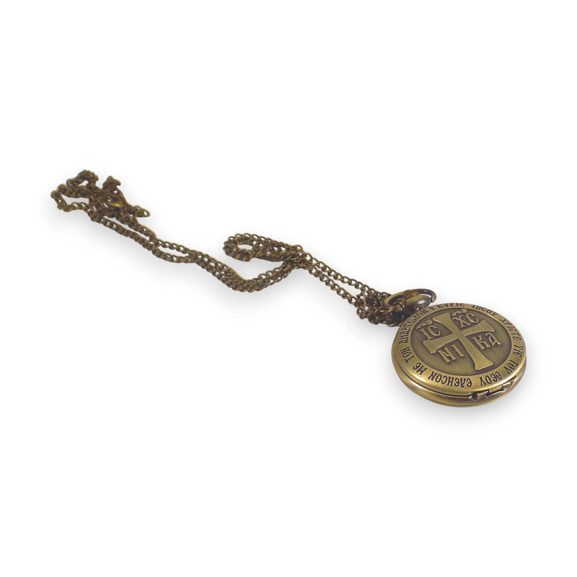 Ρολόι τσέπης εποχής με ανάγλυφο εξωτερικό περίβλημα και διακριτικό χριστιανικό σύμβολο ΙΣ ΧΣ ΝΙ ΚΑ.