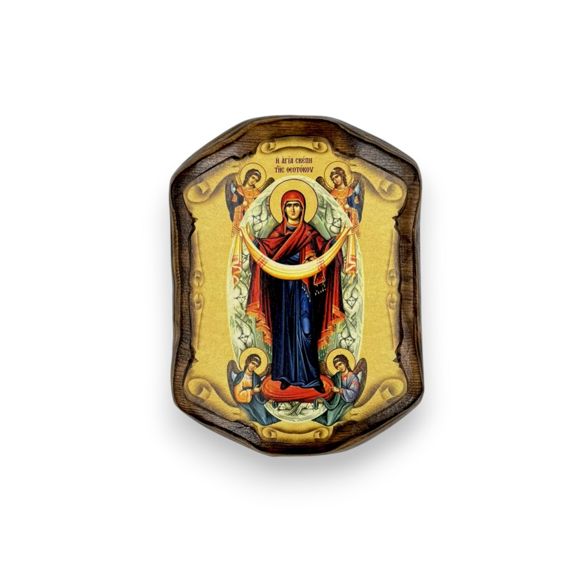 Χειροποίητη εικόνα δύο επιπέδων της Αγίας Σκέπης της Θεοτόκου, κατασκευασμένη από φυσικό ξύλο καρυδιάς, με ιδιαίτερη ξυλόγλυπτη επεξεργασία.