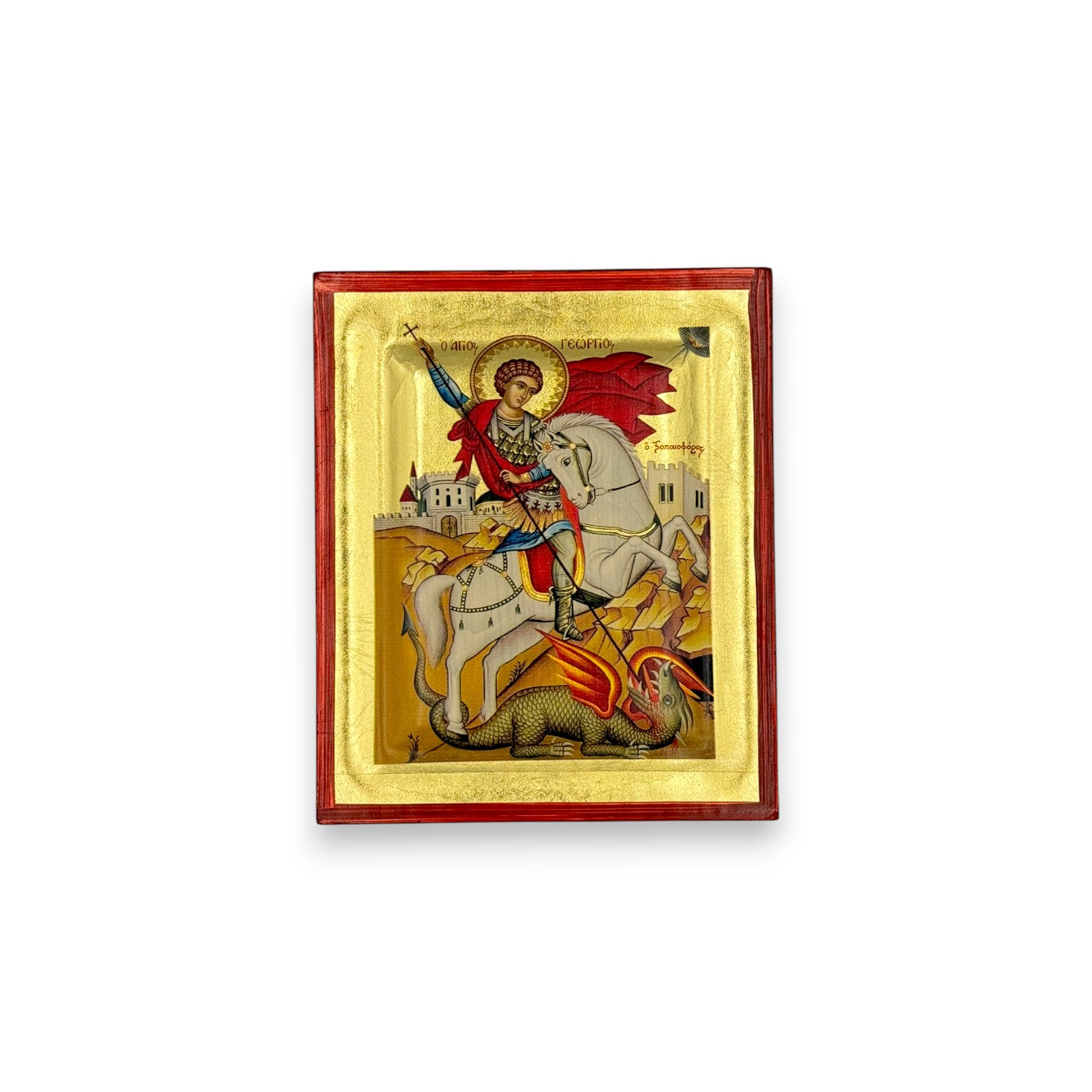 Χειροποίητη ένσκαπτη εικόνα του Αγίου Γεωργίου, με εκτύπωση σε επιχρυσωμένο καμβά, τοποθετημένο πάνω σε ξύλινη βάση υψηλής ποιότητας.