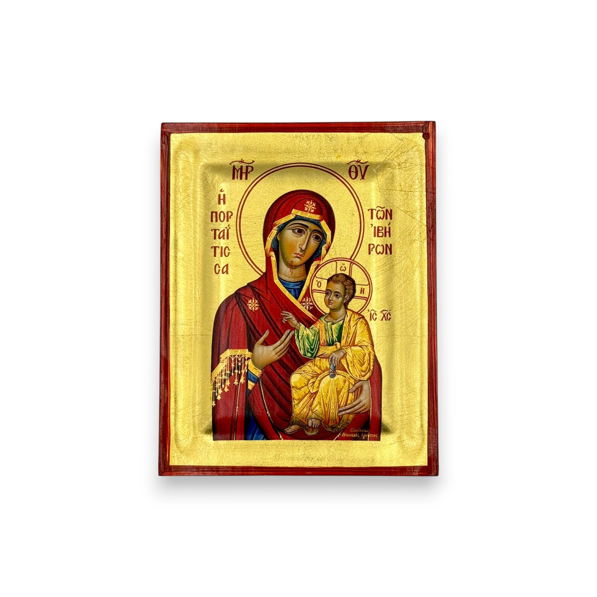 Χειροποίητη ένσκαπτη εικόνα της Παναγίας Πορταίτισσας των Ιβήρων, με εκτύπωση σε επιχρυσωμένο καμβά, τοποθετημένο πάνω σε ξύλινη βάση υψηλής ποιότητας.