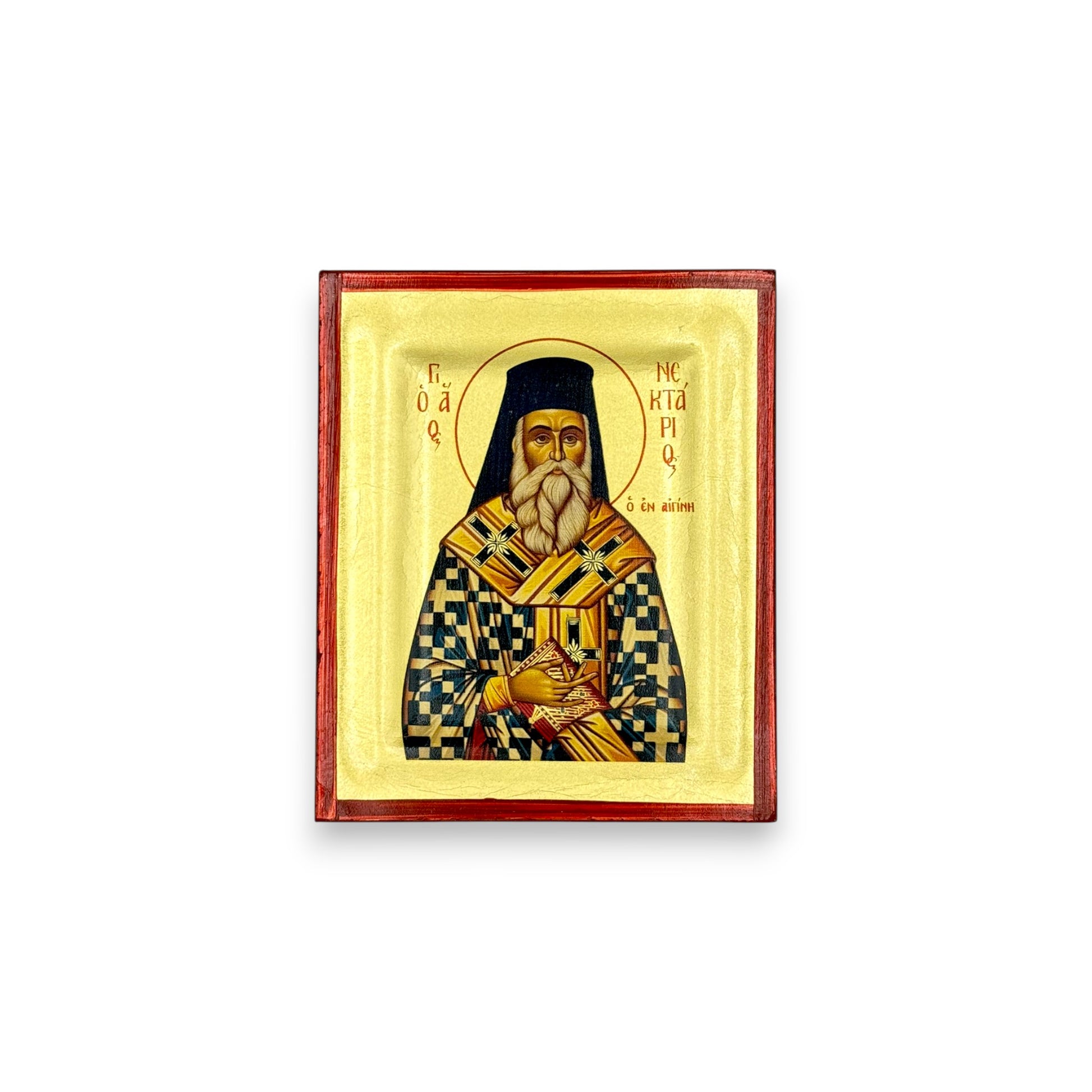 Χειροποίητη ένσκαπτη εικόνα του Αγίου Νεκταρίου, με εκτύπωση σε επιχρυσωμένο καμβά, τοποθετημένο πάνω σε ξύλινη βάση υψηλής ποιότητας.