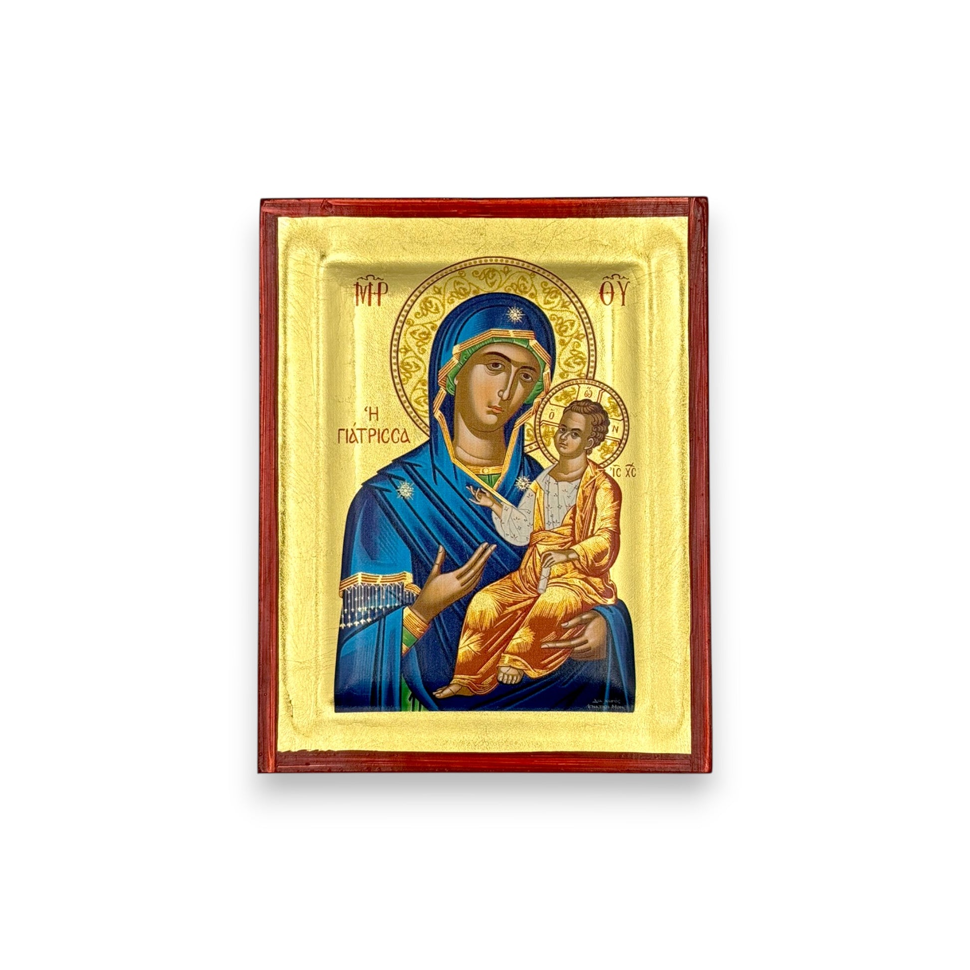 Χειροποίητη ένσκαπτη εικόνα της Παναγίας Γιάτρισσας , με εκτύπωση σε επιχρυσωμένο καμβά.