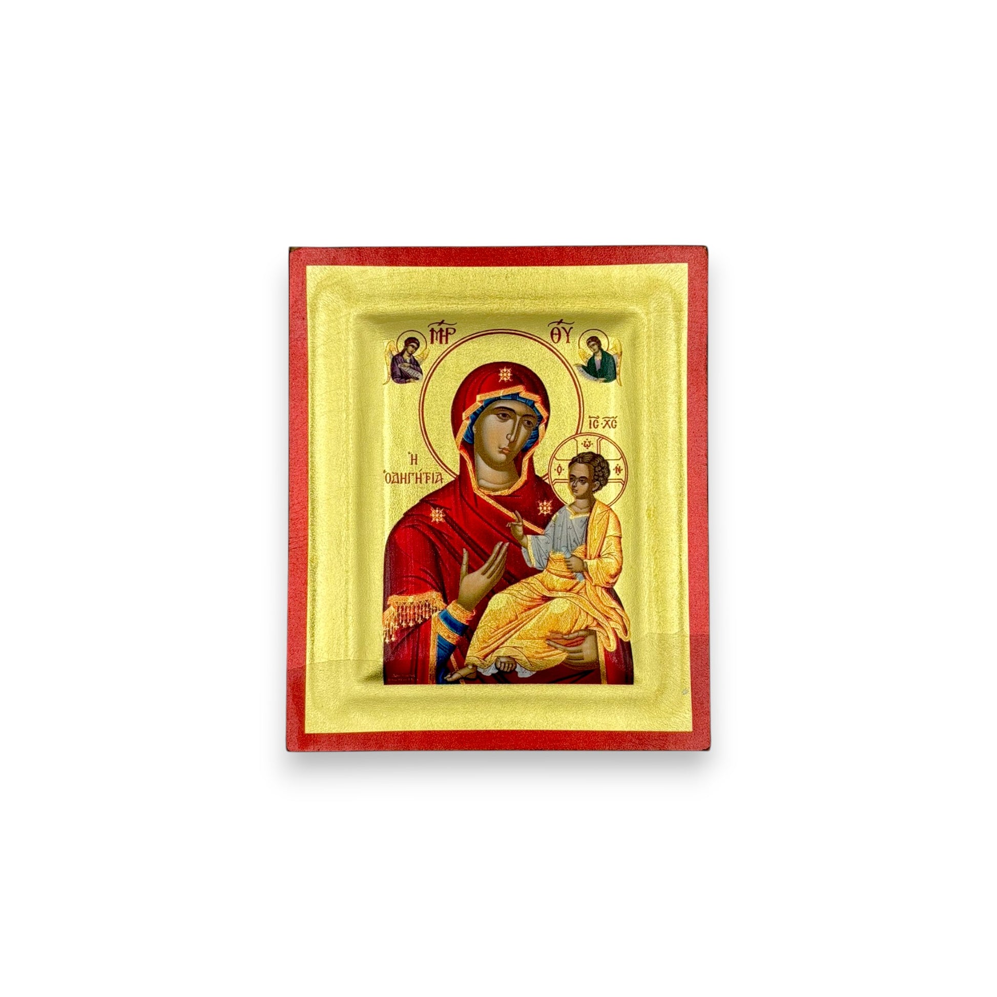 Χειροποίητη ένσκαπτη εικόνα της Παναγίας της Οδηγήτριας, με εκτύπωση σε επιχρυσωμένο καμβά.