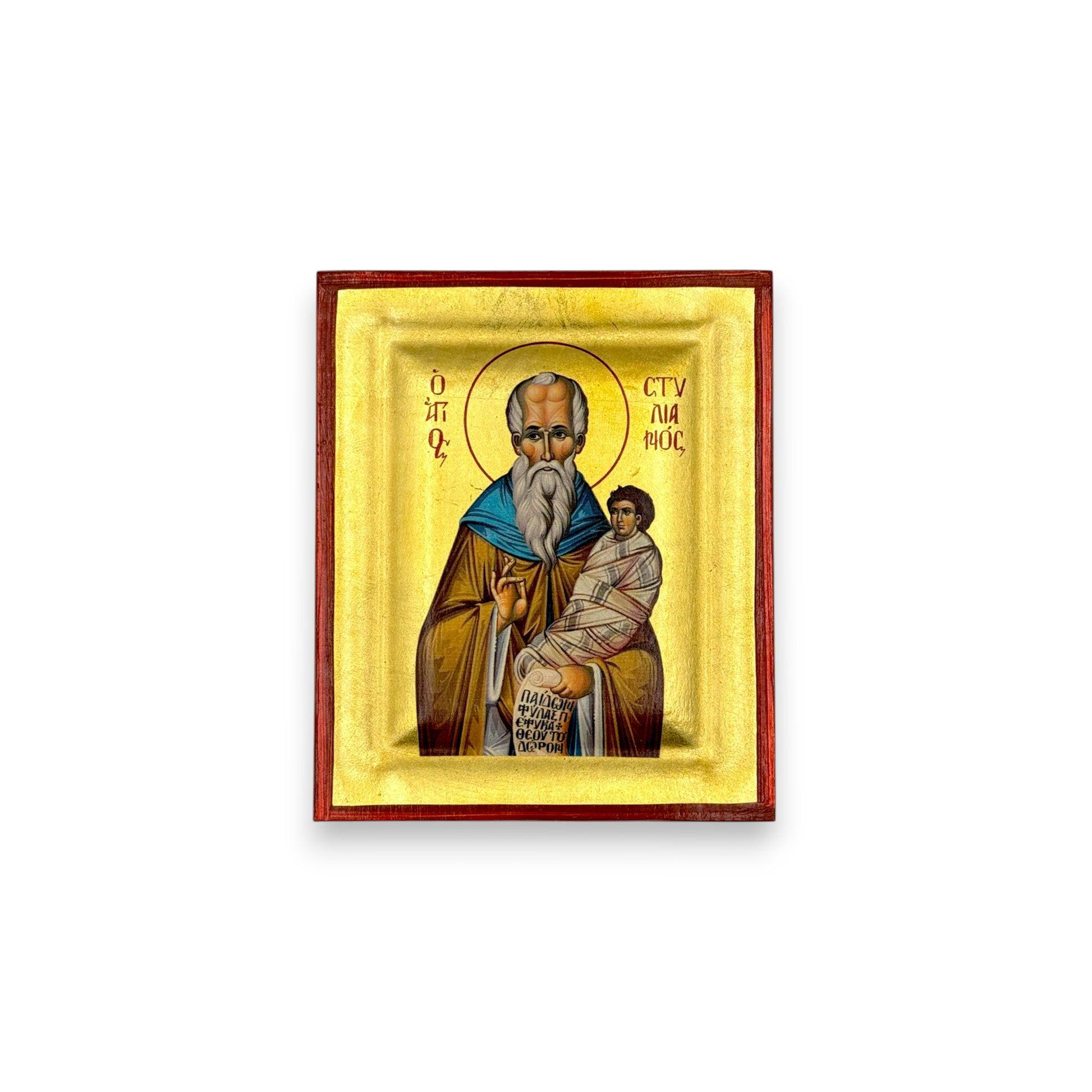 Χειροποίητη ένσκαπτη εικόνα του Αγίου Στυλιανού, με εκτύπωση σε επιχρυσωμένο καμβά, τοποθετημένο πάνω σε ξύλινη βάση υψηλής ποιότητας.