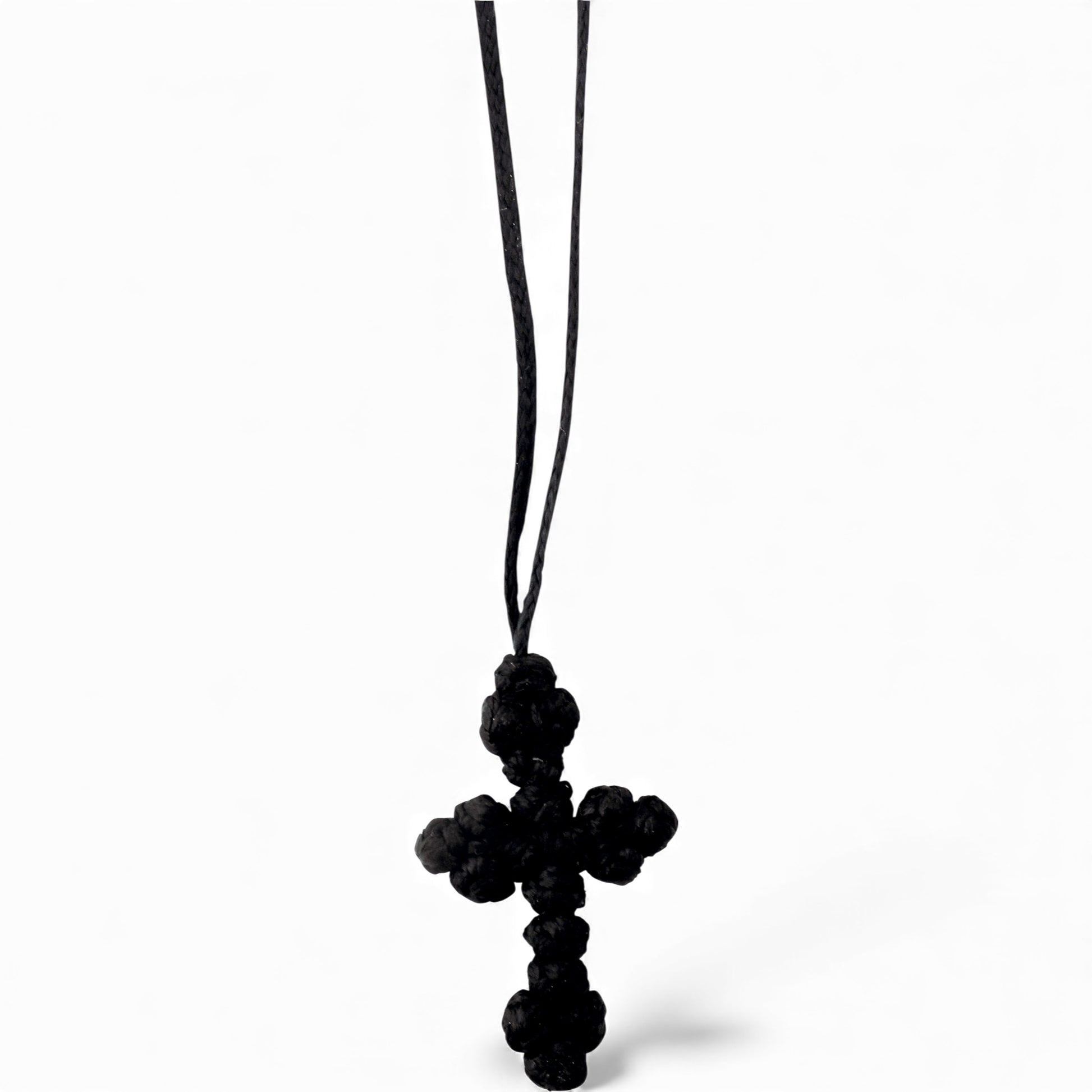 Χειροποίητος σταυρός λαιμού από κόμπους, πλεγμένος με παραδοσιακή μοναστηριακή τεχνική.