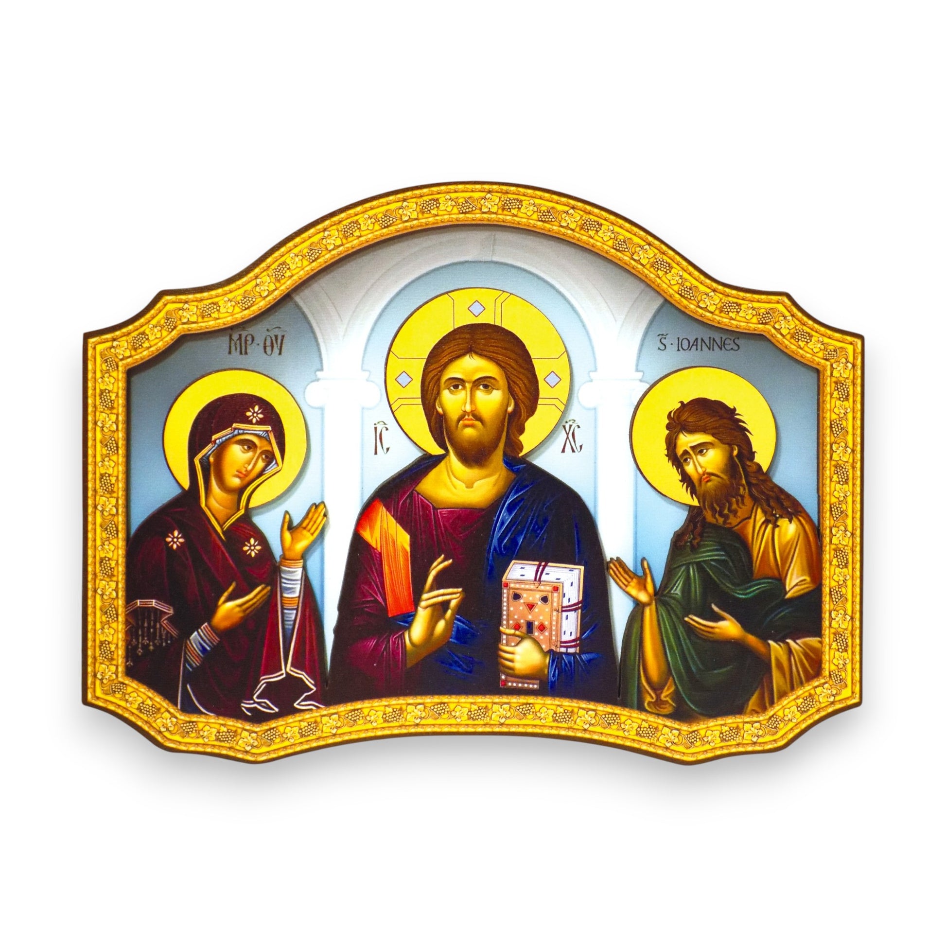 Ξύλινη επιτραπέζια εικόνα υψηλής αισθητικής, με εκτύπωση λέιζερ, που απεικονίζει την Πανάγια, τον Ιησού Χριστό και τον Άγιο Ιωάννη τον Πρόδρομο.